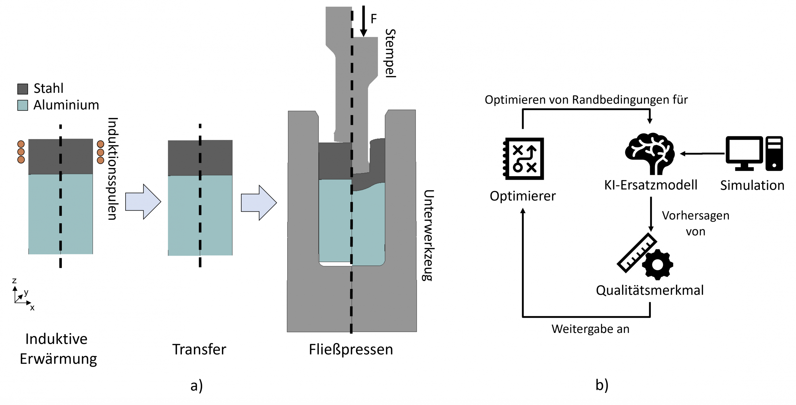 Die im Projekt betrachtete hybride Prozesskette zum Napfrückwärtsfließpressen wird in Abbildung 1 a) gezeigt. Sie besteht aus einer induktiven Erwärmung eines zuvor gefügten hybriden Bauteils, einem Transfer zur Presseneinheit und dem abschließenden Napfrückwärtsfließpressen. Die Methodik wird in Abbildung 1 b) dargestellt.