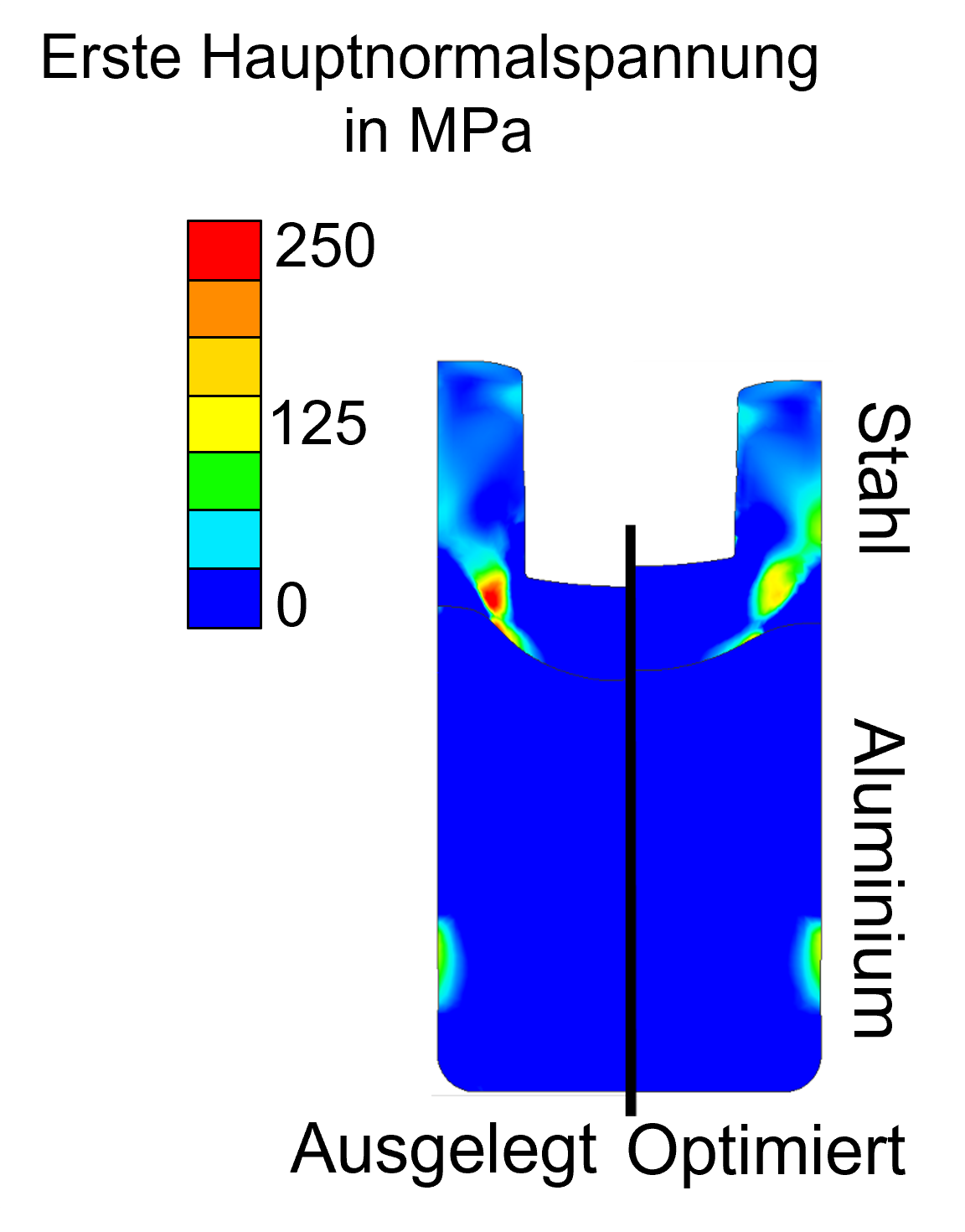 Erste Hauptnormalspannung nach Auslegung und nach Optimierung | Quelle: IFUM Hannover, Eduard Ortlieb, Hendrik Wester, Johanna Uhe, Bernd-Arno Behrens, AI supported process optimisation in a multi-material cup backward extrusion process chain, Materials Research Proceedings, Vol. 54, pp 889-898, 2025