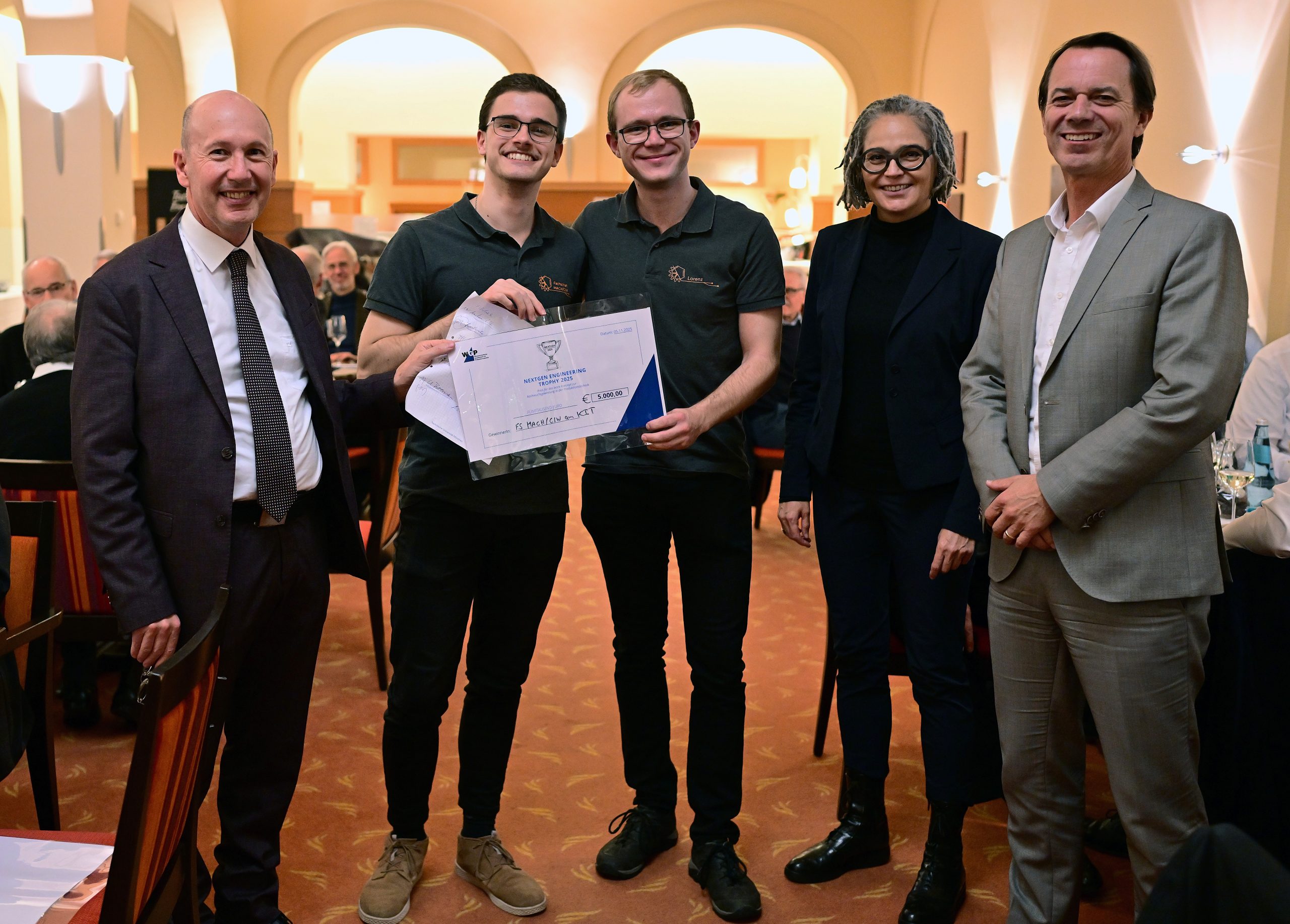 Bild 2: Übergabe des NextGen Engineering Trophy Award an das Team des Karlsruher Instituts für Technologie (v.l.n.r. Prof. Michael Zäh, Emilio Ruiz Quincke, Lorenz Neumann, Prof.in Kirsten Bobzin, Prof. Thomas Bergs), 05. November 2025; Quelle: Tobias Kaufmann, RWTH Aachen