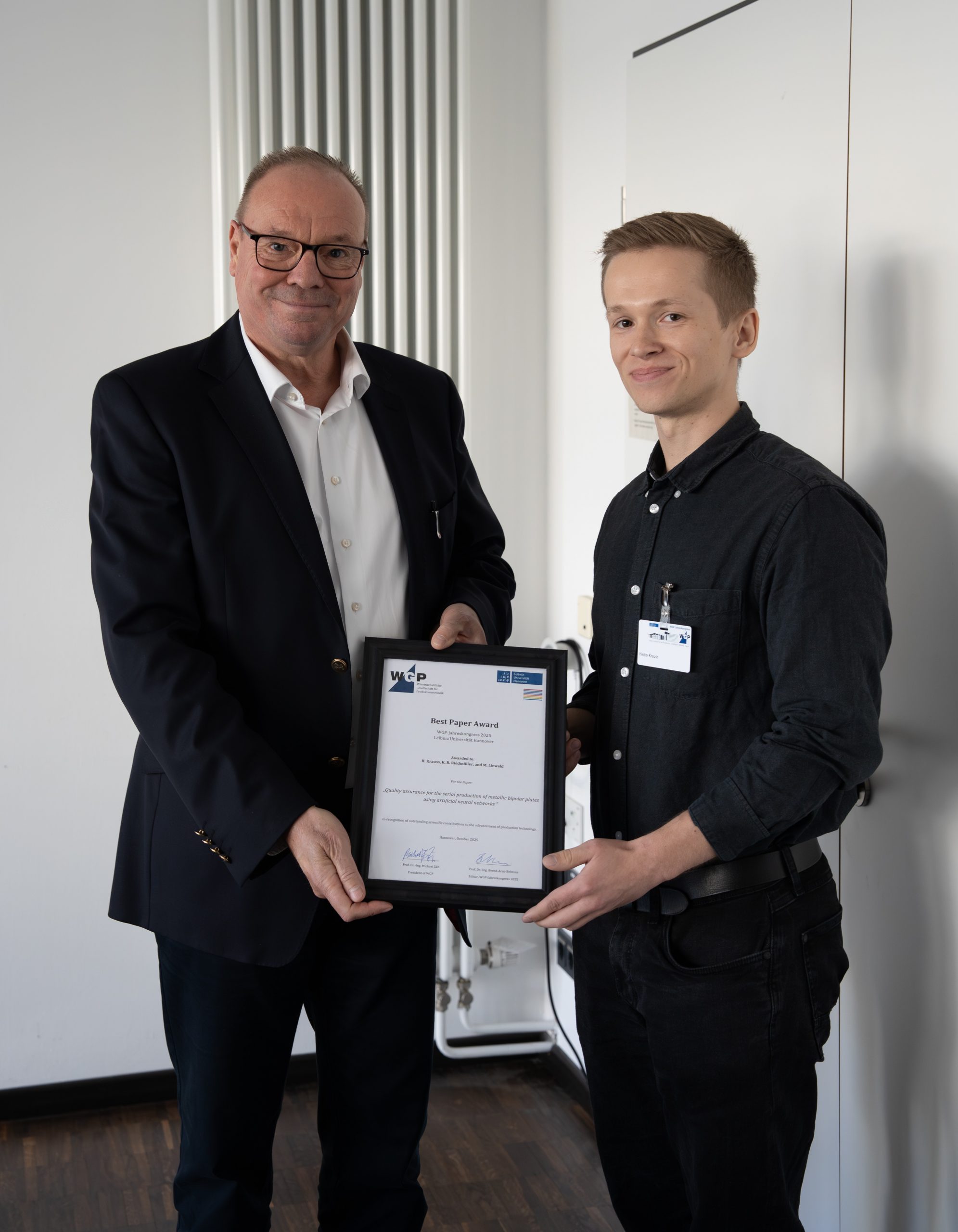 Bild 2: Übergabe des Best Paper Award auf dem WGP-Jahreskongress 2025, (v.l.n.r.), Prof. Bernd-Arno Behrens, IFUM Hannover; Heiko Krauss, IFU Stuttgart; Quelle: René Laeger
