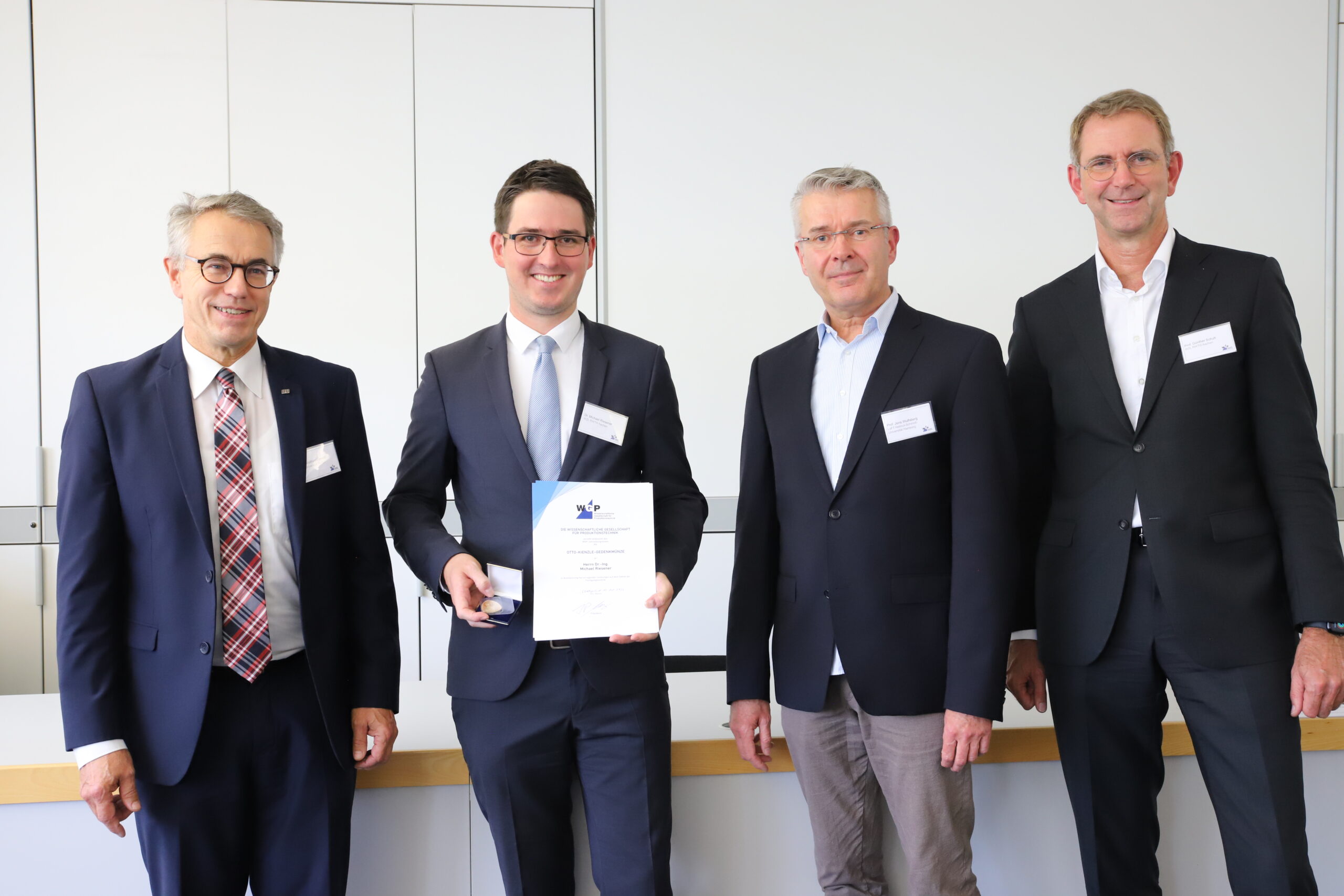 Beitragsbild: Verleihung der Otto-Kienzle-Gedenkmünze, (v.l.n.r.) Prof. Mathias Liewald (Institut für Umformtechnik IFU, Universität Stuttgart), Dr. Michael Riesener (Werkzeugmaschinenlabor WZL, RWTH Aachen), Prof. Jens P. Wulfsberg, Präsident der WGP (Laboratorium Fertigungstechnik LaFT Universität Hamburg), Prof. Günther Schuh (WZL Aachen) Quelle: Maxim Beck, IFU Stuttgart