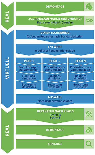Wenn bei der Planung solcher Regenerationsvorhaben ein Blick auf die Wirkbeziehungen zwischen allen betroffenen Bereichen der Wertschöpfung geworfen wird, so das Fazit der Wissenschaftler, lassen sich die Zeiten und Kosten reduzieren, Bestände klein halten und Regenerationsprozesse effizient gestalten. Man spart in Summe Ressourcen für die Produktion neuer Laufschaufeln und Turbinen – und damit natürlich Energie.