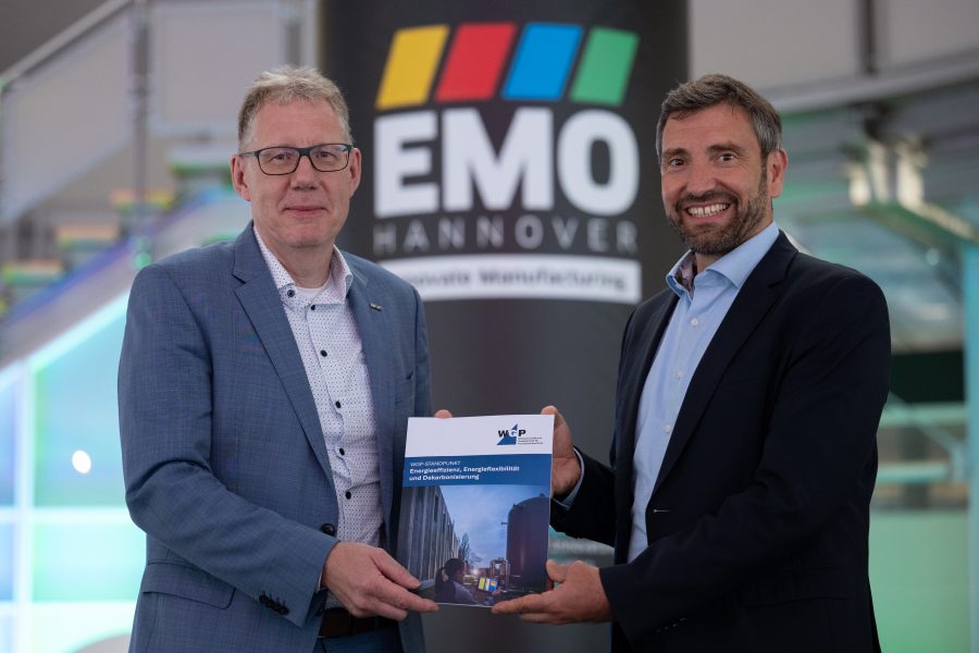 Beitragsbild: Übergabe des WGP-Positionspapiers „Energieeffizienz, Energieflexibilität, Dekarbonisierung“ an Dr. Markus Heering, Geschäftsführer VDW im Rahmen der EMO Hannover 2025, 24.09.2025 (v.l.n.r.): Dr. Markus Heering (VDW), Prof. Matthias Weigold (PTW Darmstadt); Quelle: Deutsche Messe / Rainer Jensen